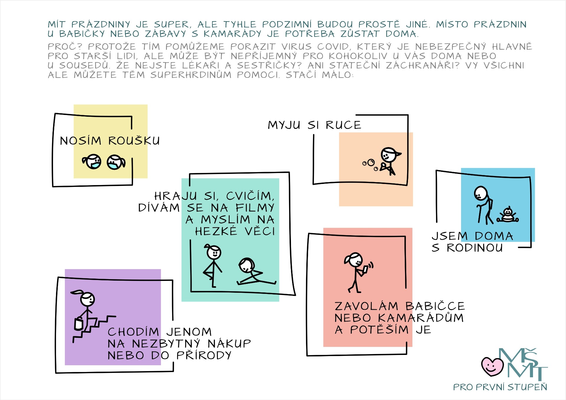 Žádáme Vás, aby děti měly nejméně 4 roušky/ den, igelitové pytlíky. Nadále platí, že si žáci při vstupu do budovy školy umyjí ruce, použijí dezinfekční gel a dodržují veškerá hygienická opatření spojena s COVID - 19. V případě nemoci neposílejte své děti do školy, abychom předešli dalšímu šíření nemoci mezi ostatní žáky školy. Děkujeme.